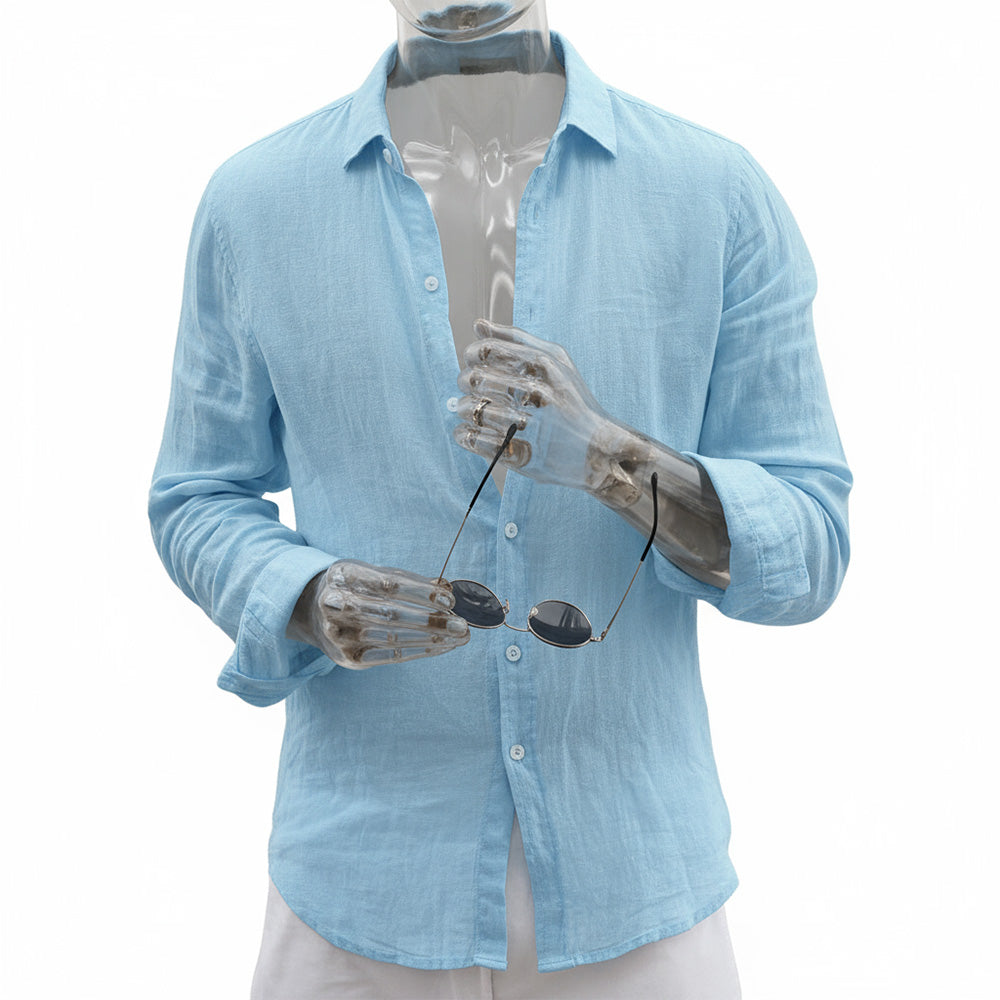 Crafted from a premium cotton-linen blend, this handsome shirt blends ease with refined craftsmanship. Its breathable fabric adapts gracefully to the movements, while the open collar and fluid silhouette convey a subtle, relaxed elegance. An adaptable wardrobe staple perfect for coastal nights or refined casual occasions.
