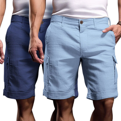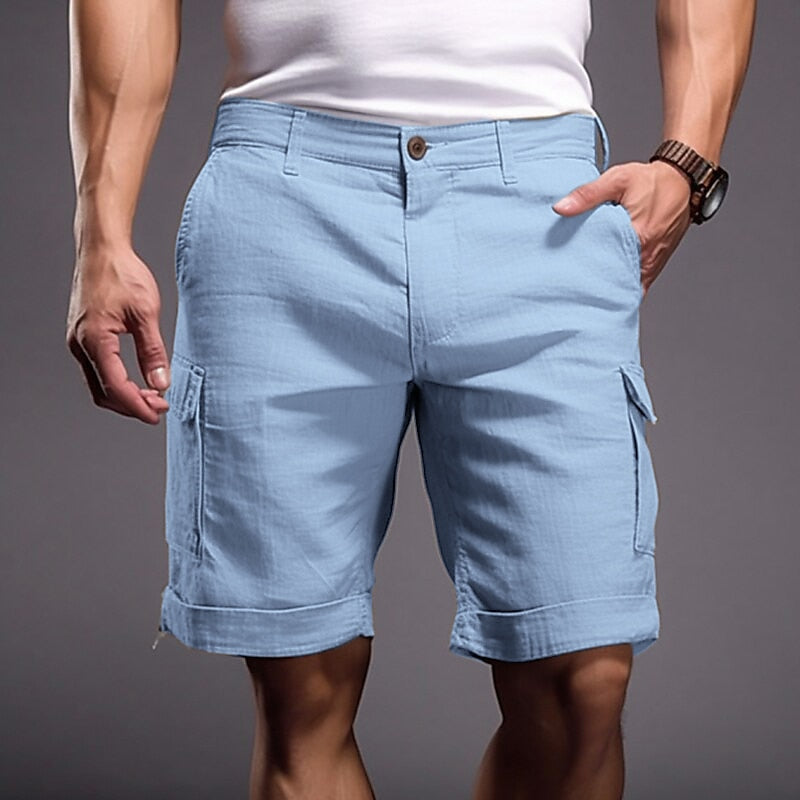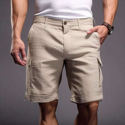Crafted from a ultra-luxurious blend of linen and cotton, these timeless shorts offer breathable ease with a structured finish, elevated by crisp folded hems and functional cargo-style pockets—designed for movement, purpose, and a polished off-duty look.