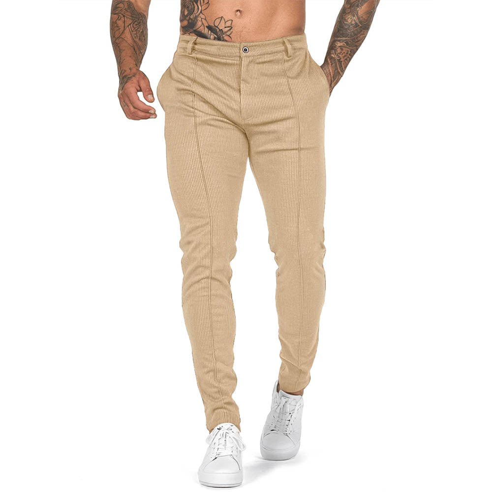 Crafted to refine the silhouette, these slim-fit pinstripe trousers blend tailored elegance with modern stretch comfort. Designed for effortless versatility, they transition seamlessly from sharp streetwear to elevated casual, always delivering presence with polish